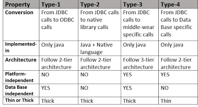 - Type 4 driver, a pure Java-based driver communicates directly with the vendor's database through socket connection.