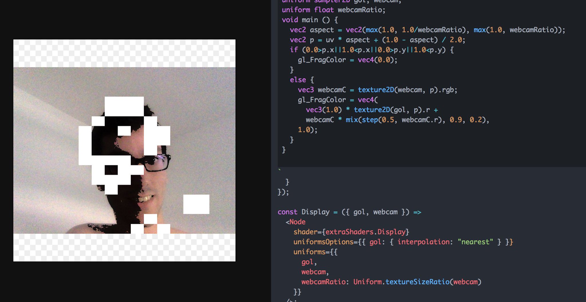 uniform vec2and that will inject the size of the given texture. whereinputit whatever you can give to a texture uniform (e.g.uniforms={{ t: input, tSize: Uniform.textureSize(input) }}) - introduce Uniform.textureSizeRatio(input) that is doing like textureSize, except it only send the