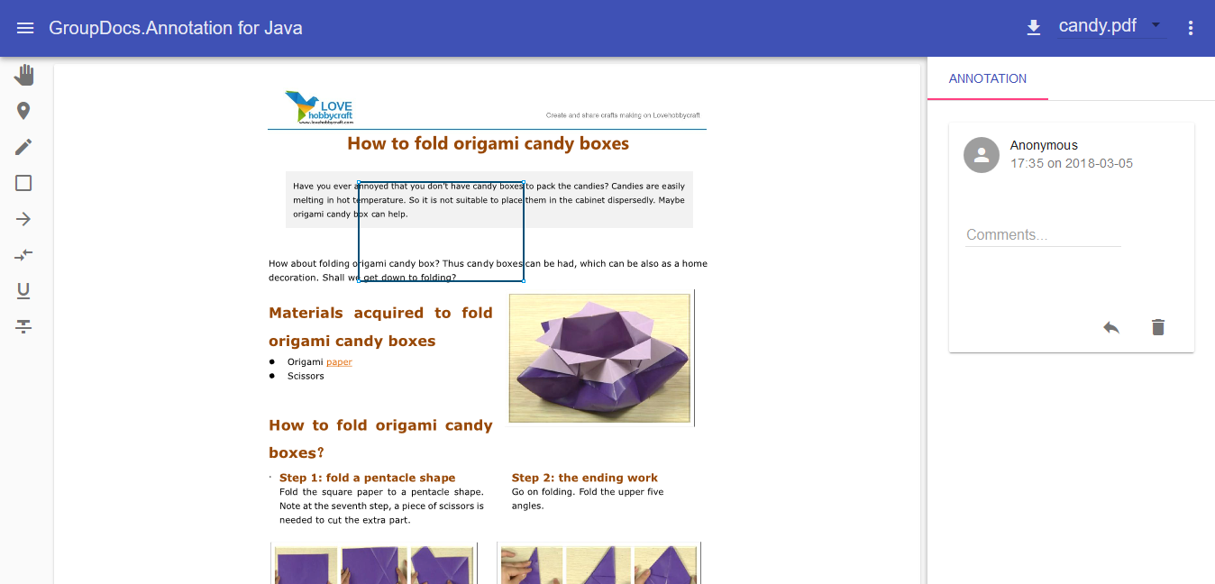 This application allows user to view and annotate a document in a web browser. Users can view document pages in image form and draw annotations on it. The annotated file can be downloaded later.